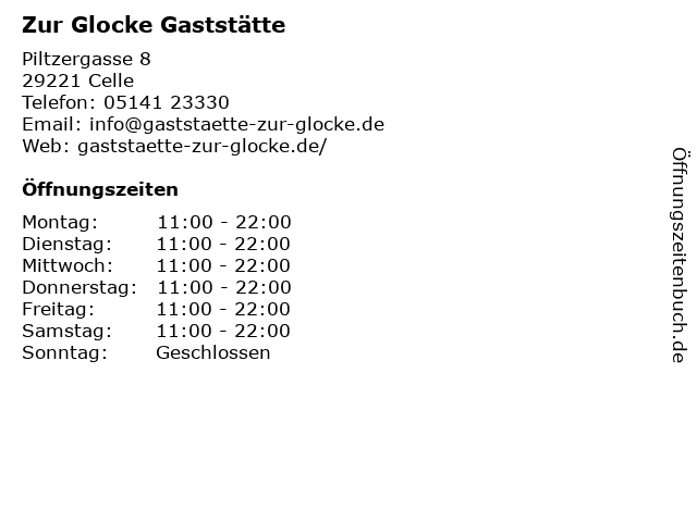 | Öffnungszeiten Zur Glocke Gaststätte in Celle anzeigen | |