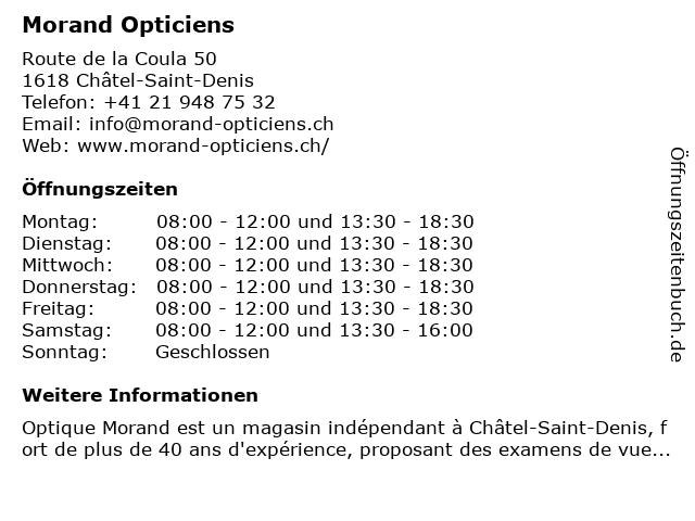 | Öffnungszeiten Morand Opticiens in Châtel-Saint-Denis anzeigen | |