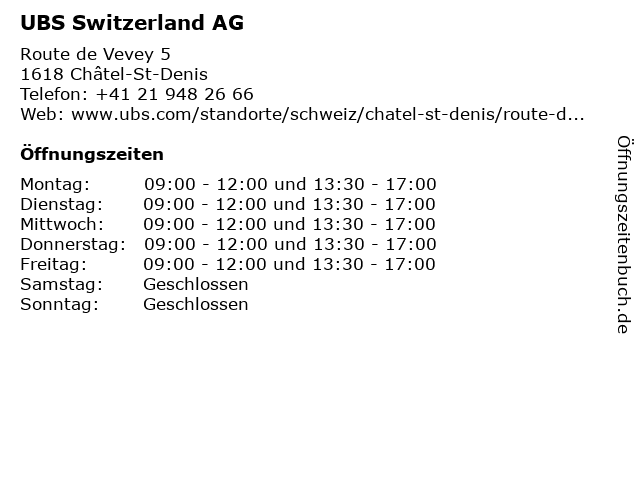 | Öffnungszeiten UBS Switzerland AG in Châtel-St-Denis anzeigen | |