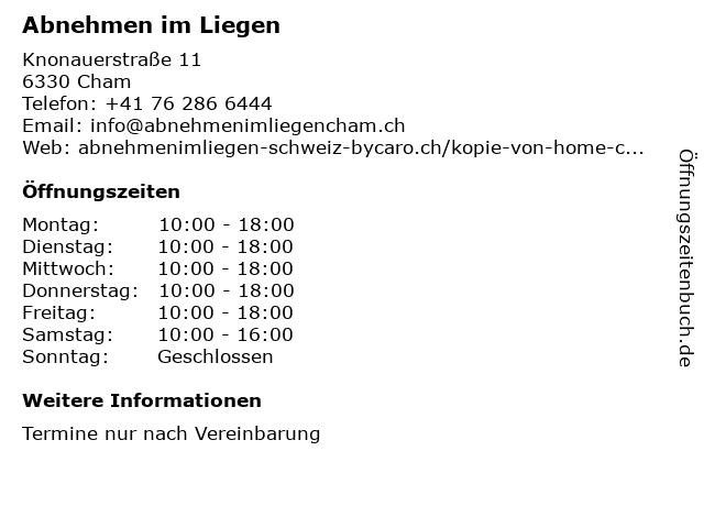 | Öffnungszeiten Abnehmen im Liegen in Cham anzeigen | |