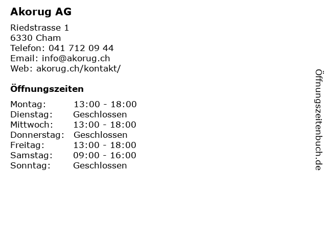 | Öffnungszeiten Akorug AG in Cham anzeigen | |