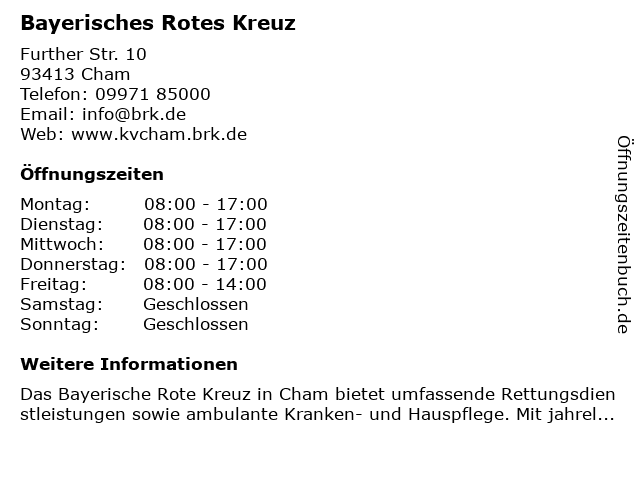 | Öffnungszeiten Bayerisches Rotes Kreuz in Cham anzeigen | |