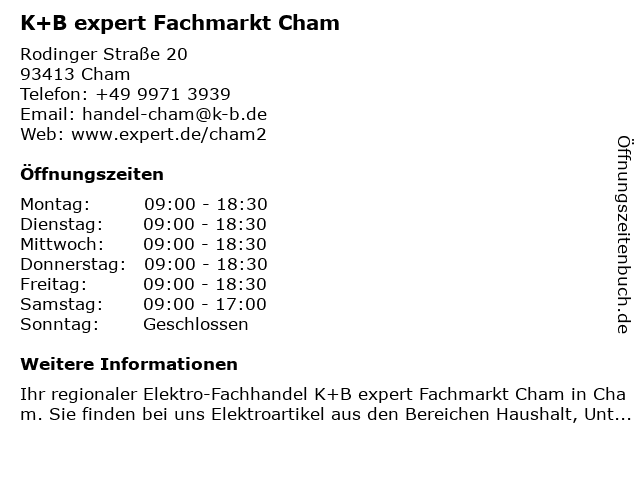 | Öffnungszeiten K+B expert Fachmarkt Cham in Cham anzeigen | |