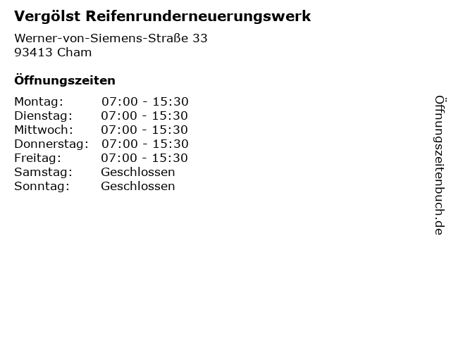 | Öffnungszeiten Vergölst Reifenrunderneuerungswerk in Cham anzeigen | |