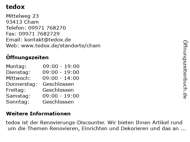 | Öffnungszeiten tedox in Cham anzeigen | |