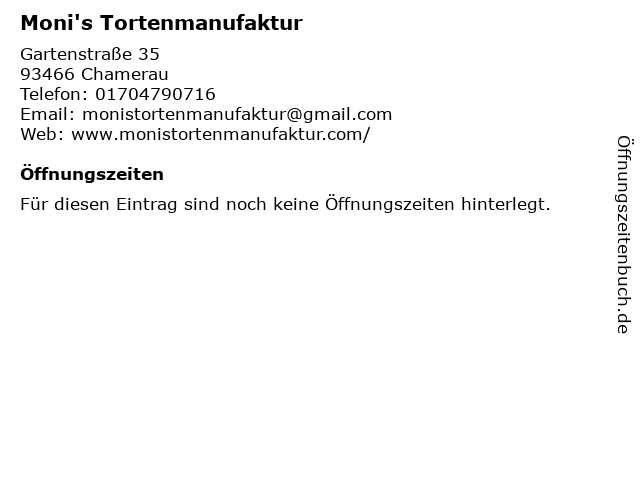| Öffnungszeiten Moni's Tortenmanufaktur in Chamerau anzeigen | |