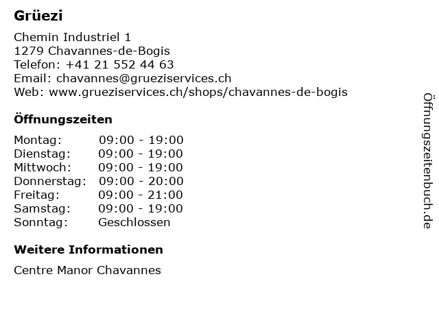 | Öffnungszeiten Grüezi in Chavannes-de-Bogis anzeigen | |