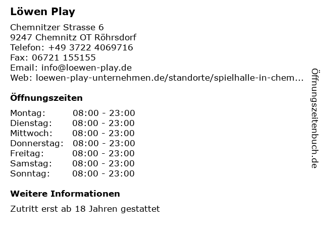 | Öffnungszeiten Löwen Play in Chemnitz OT Röhrsdorf anzeigen | |