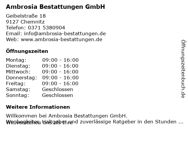 | Öffnungszeiten Ambrosia Bestattungen GmbH in Chemnitz anzeigen | |