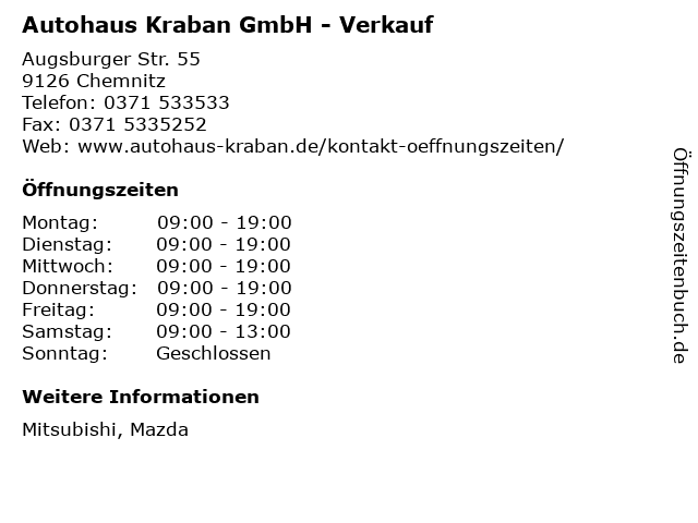 2 Autohaus Kraban GmbH Mazda Servicepartner / Mitsubishi Vertragshändler (Entfernung: 0,00 km) Augsburger Str. 55, 09126 Chemnitz 6 Auto Hänel GbR - Werkstatt und Ersatzteilverkauf (Entfernung: 32,20 km) Annaberger Str. 92, 08352 Raschau |