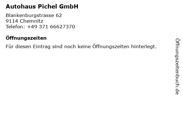 | Öffnungszeiten Autohaus Pichel GmbH in Chemnitz anzeigen | |