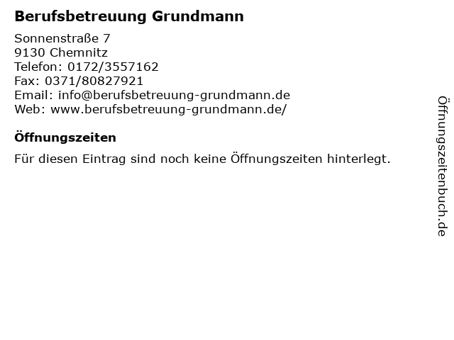 | Öffnungszeiten Berufsbetreuung Grundmann in Chemnitz anzeigen | |