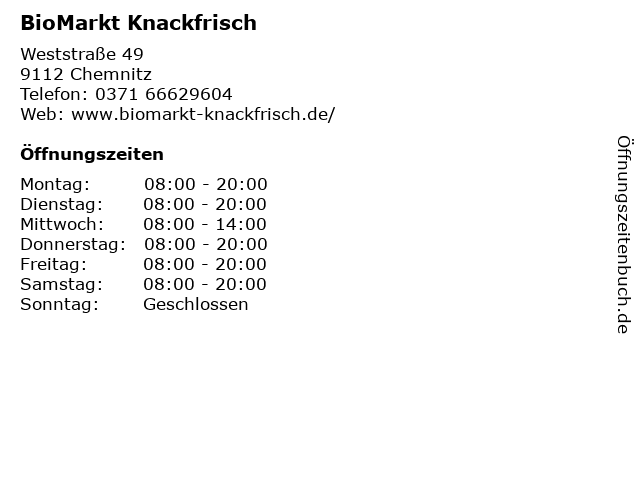 | Öffnungszeiten BioMarkt Knackfrisch in Chemnitz anzeigen | |