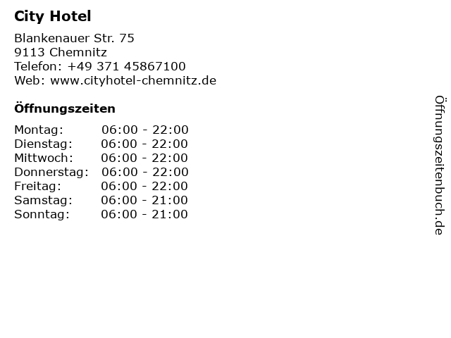 | Öffnungszeiten City Hotel in Chemnitz anzeigen | |