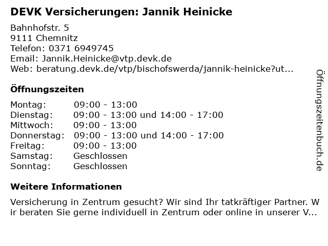 2 DEVK Versicherung Birgit Hartmann Bezirksverkaufsleiterin (Entfernung: 0,02 km) Bahnhofstraße 5, 09111 Chemnitz 3 5 DEVK Versicherung Falk Rowinski Bereichsleiter (Entfernung: 2,62 km) Bernsdorfer Straße 135, 09126 Chemnitz 6 |