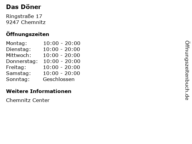 | Öffnungszeiten Das Döner in Chemnitz anzeigen | |