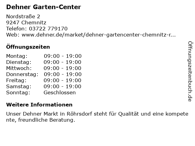| Öffnungszeiten Dehner Garten-Center in Chemnitz anzeigen | |