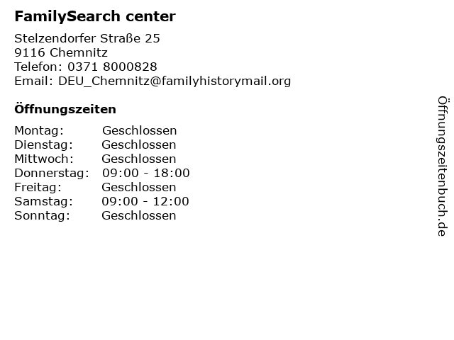 | Öffnungszeiten FamilySearch center in Chemnitz anzeigen | |