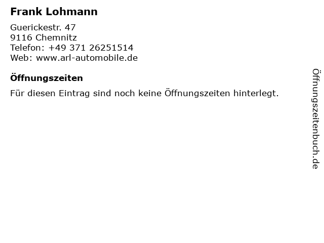 | Öffnungszeiten Frank Lohmann in Chemnitz anzeigen | |