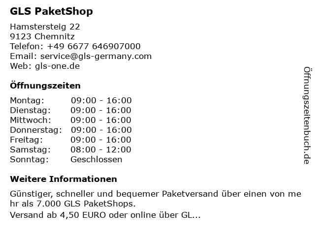 | Öffnungszeiten GLS PaketShop in Chemnitz anzeigen | |