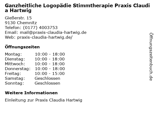 2 Anne-Grit Valentin Praxis für ganzheitliche Physiotherapie (Entfernung: 1,24 km) Moritzstr. 19, 09111 Chemnitz 4 Evelyn Penzlin Praxis für Logopädie Heymann (Entfernung: 1,63 km) Zschopauer str. 107, 09126 Chemnitz 6 Thera Plus Med GmbH - Praxis für Ergotherapie und Logopädie (Entfernung: 1,81 km) Heinrich-Schütz-Straße 138, 09130 Chemnitz |