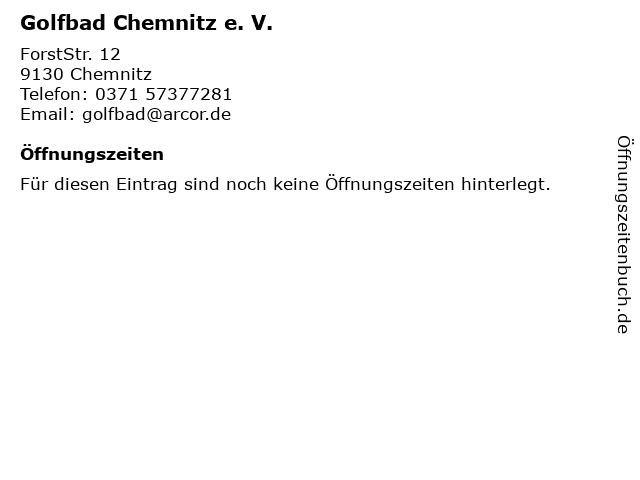 | Öffnungszeiten Golfbad Chemnitz e. V. in Chemnitz anzeigen | |