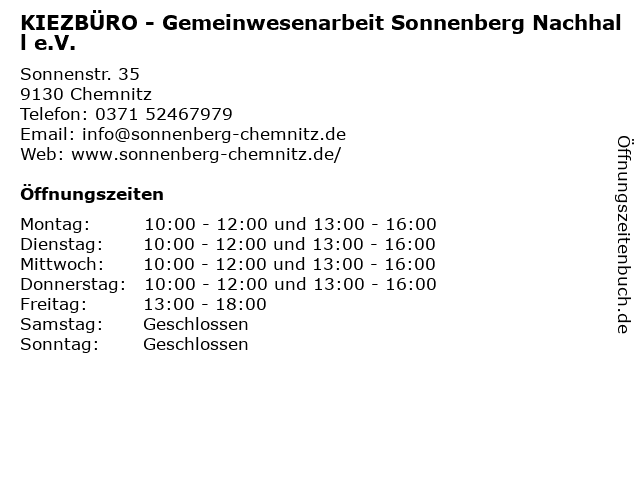 Branchen & Suchbegriffe zu KIEZBÜRO - Gemeinwesenarbeit Sonnenberg Nachhall e.V.:e.v., gemeinwesen, gemeinwesenarbeit, kiezbüro, nachhall, regional, sonnenberg, stadtteil, veranstaltungen, zeitung |