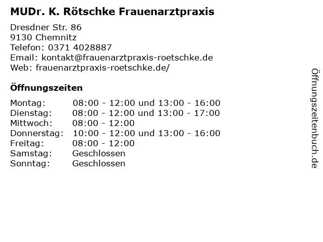 3 Praxis Dr. med. Barbara Röber Frauenarztpraxis (Entfernung: 0,95 km) Straße der Nationen 103, 09113 Chemnitz 4 Hahn Ulrike Dr. med., Liebing Simone Dr. med. Frauenarztpraxis (Entfernung: 1,70 km) Fürstenstr. 141, 09130 Chemnitz 6 |