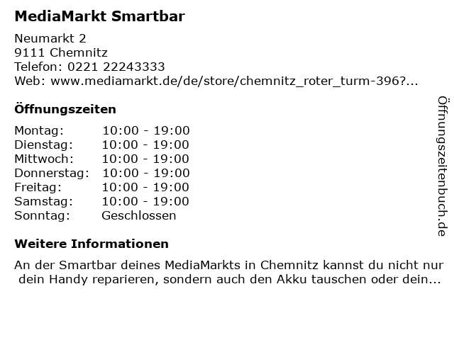 | Öffnungszeiten MediaMarkt Smartbar in Chemnitz anzeigen | |