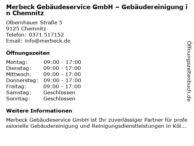 Branchen & Suchbegriffe zu Merbeck Gebäudeservice GmbH – Gebäudereinigung in Chemnitz:außenreinigung, baureinigung, fensterreinigung, fussboden- und fliesenreinigung, gastronomiereinigung, gebäudereinigung, gebäudeservice, gewerbliche reinigung, merbeck, – |