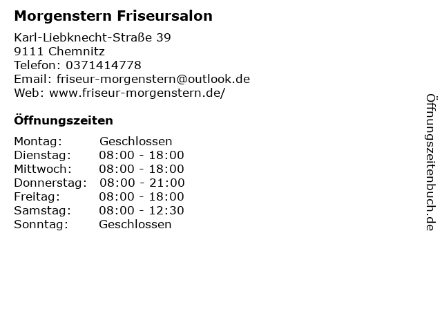 | Öffnungszeiten Morgenstern Friseursalon in Chemnitz anzeigen | |