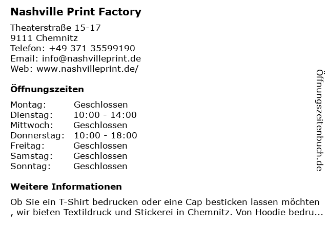 | Öffnungszeiten Nashville Print Factory in Chemnitz anzeigen | |