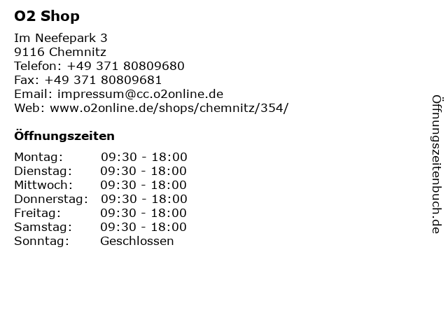 | Öffnungszeiten O2 Shop in Chemnitz anzeigen | |