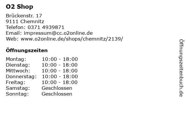 | Öffnungszeiten O2 Shop in Chemnitz anzeigen | |