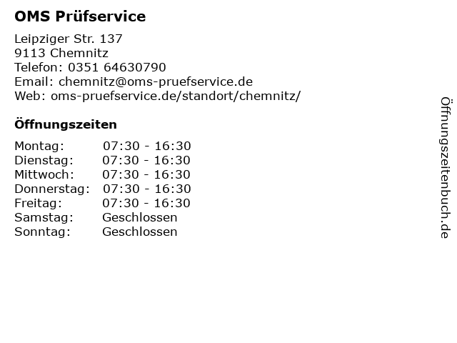 | Öffnungszeiten OMS Prüfservice in Chemnitz anzeigen | |