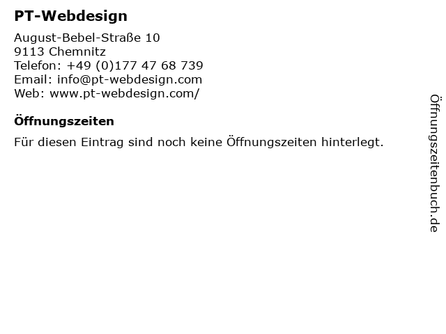 | Öffnungszeiten PT-Webdesign in Chemnitz anzeigen | |