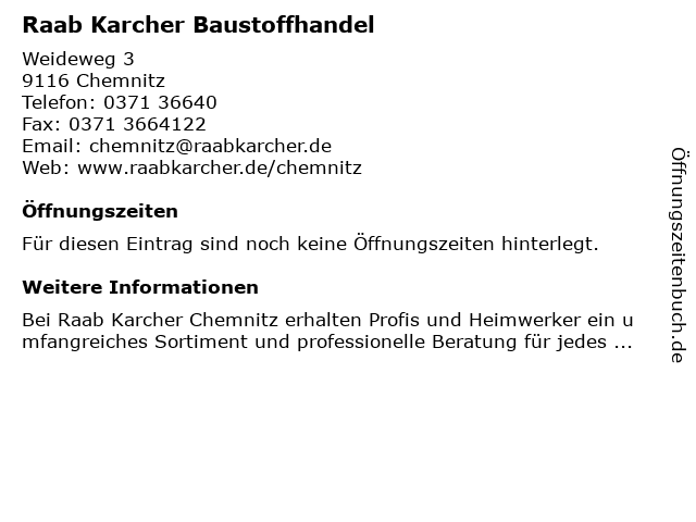 | Öffnungszeiten Raab Karcher Baustoffhandel in Chemnitz anzeigen | |
