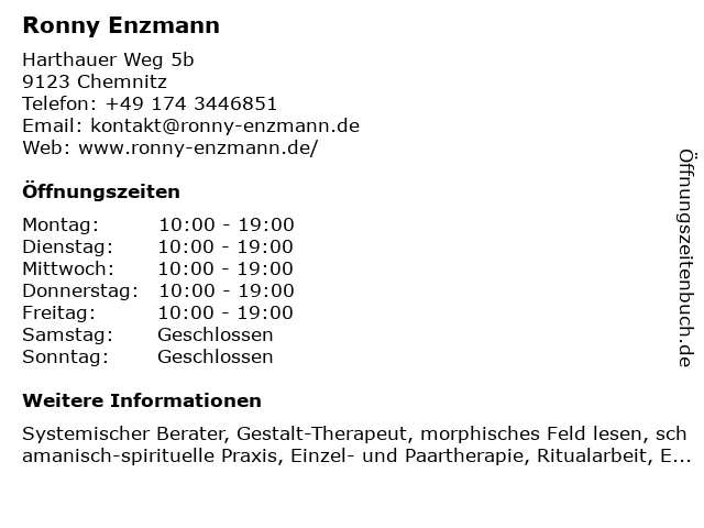 | Öffnungszeiten Ronny Enzmann in Chemnitz anzeigen | |