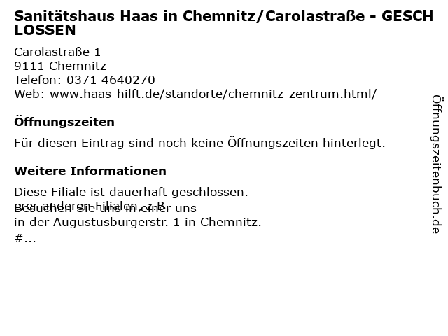| Sanitätshaus Haas in Chemnitz/Carolastraße - GESCHLOSSEN anrufen | |