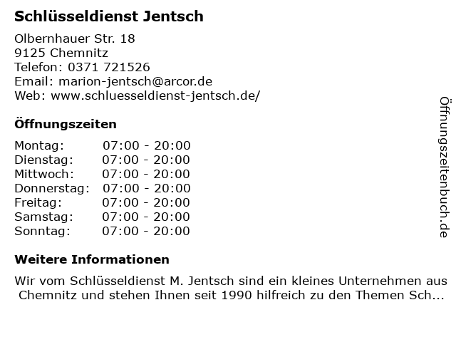 Öffnungszeiten Schlüsseldienst Jentsch in Chemnitz anzeigen | |