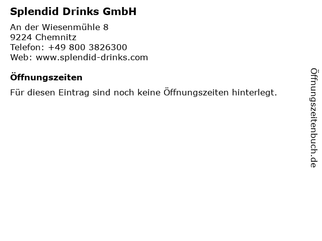 | Öffnungszeiten Splendid Drinks GmbH in Chemnitz anzeigen | |