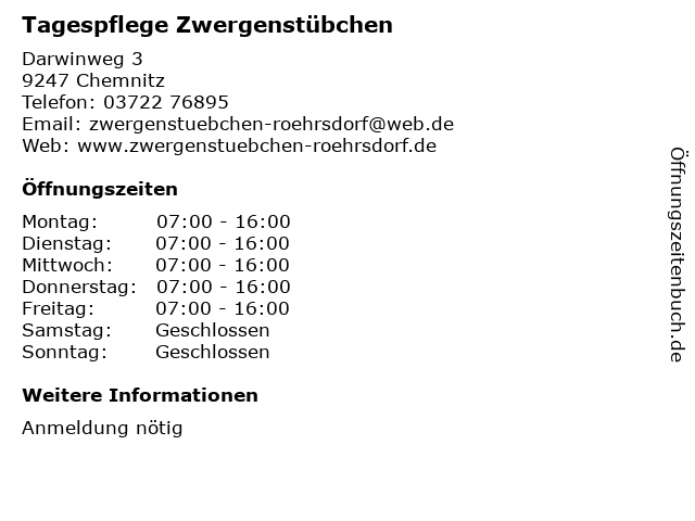 | Öffnungszeiten Tagespflege Zwergenstübchen in Chemnitz anzeigen | |