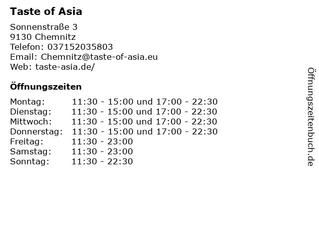 | Öffnungszeiten Taste of Asia in Chemnitz anzeigen | |