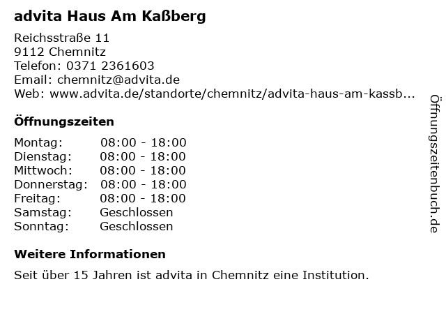 | Öffnungszeiten advita Haus Am Kaßberg in Chemnitz anzeigen | |