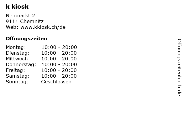 | Öffnungszeiten k kiosk in Chemnitz anzeigen | |