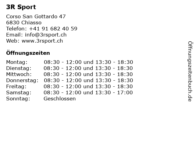 | Öffnungszeiten 3R Sport in Chiasso anzeigen | |