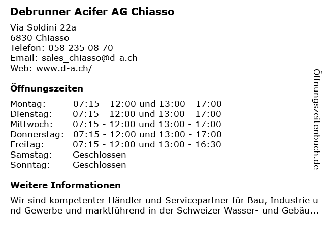 | Öffnungszeiten Debrunner Acifer AG Chiasso in Chiasso anzeigen | |