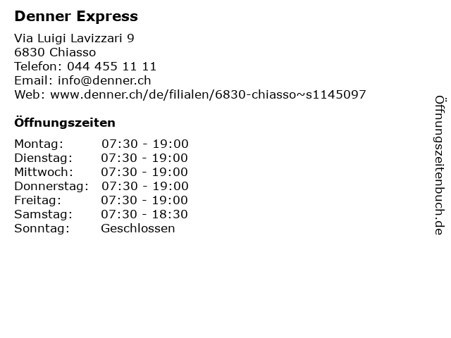 | Öffnungszeiten Denner Express in Chiasso anzeigen | |