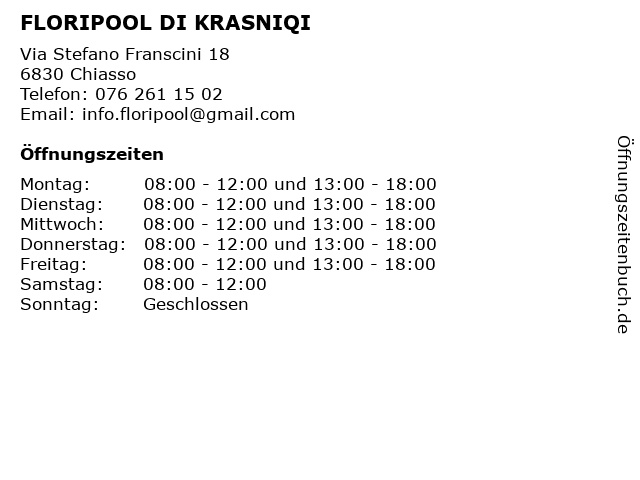 | Öffnungszeiten FLORIPOOL DI KRASNIQI in Chiasso anzeigen | |