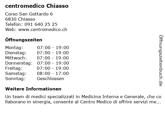| Öffnungszeiten centromedico Chiasso in Chiasso anzeigen | |